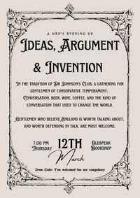 This is a men's-only evening of spirited conversation, debate, and ideas over beer, wine, coffee, and good company, inspired by Dr Johnson's famous 18th-century Club -